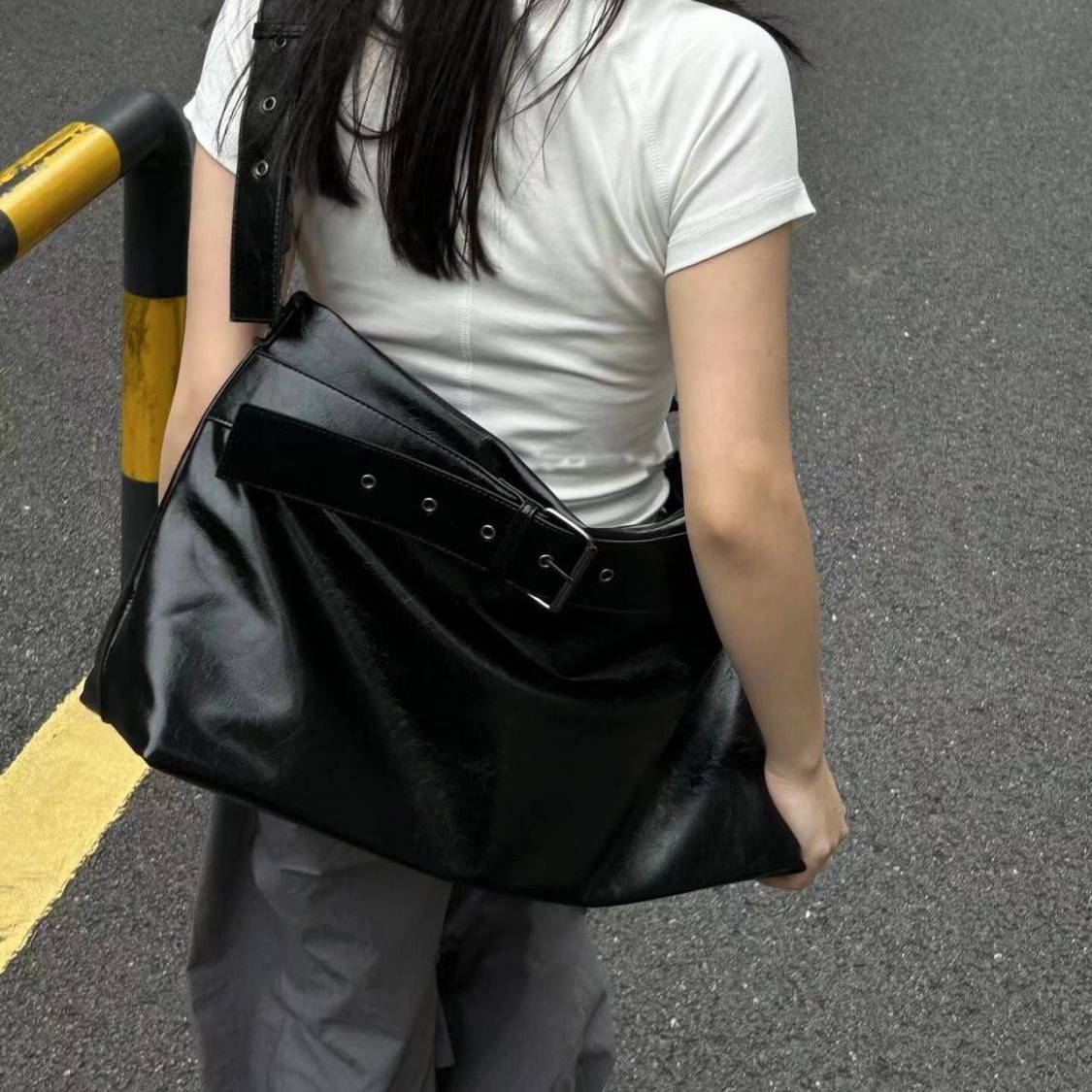 ベルトデザイン ショルダーバッグ 大容量 バッグ 黒 ワンショルダー トート 肩掛け モード系 ストリートコーデ 韓国ファッション 海外トレンド 大人女子 通勤通学 A4収納 ブラック K-B0196