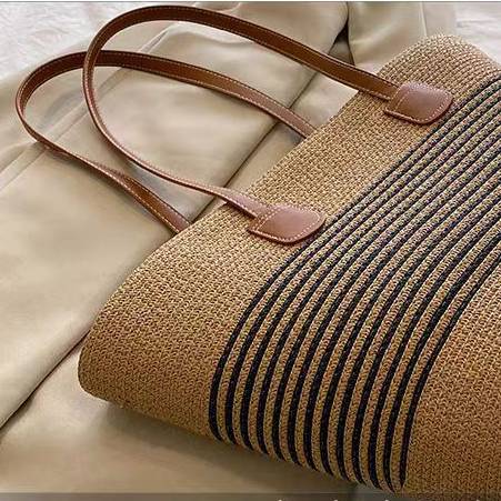 ナチュラル トートバッグ ストライプデザイン かごバッグ レディース バック 肩掛け 大容量 軽量 夏 春 カジュアル 韓国風 大人可愛い おしゃれ 人気 ブラウン K-B0206