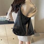 A4サイズもすっぽり入る大容量で、実用性も抜群。軽量設計で肩に負担がかかりにくく、長時間の使用でも快適。さらに同素材のポーチ付きで、荷物の整理整頓も楽に。シンプルな中にもトレンド感のあるシルエットが、幅広い年代に人気のアイテムです。