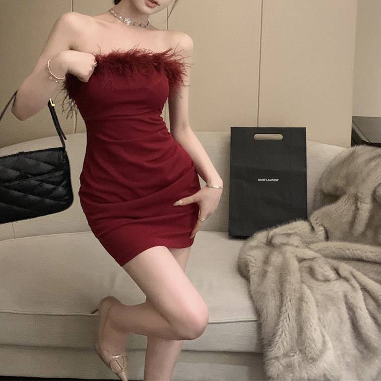 フェザー装飾が胸元にあしらわれた、エレガントでセクシーなミニワンピースです。ストラップレスのチューブトップデザインがデコルテラインを美しく引き立て、華やかなシーンで存在感を発揮します。ショート丈のタイトシルエットが女性らしいスタイルを際立たせ、パーティーや特別な日のコーディネートにぴったりです。