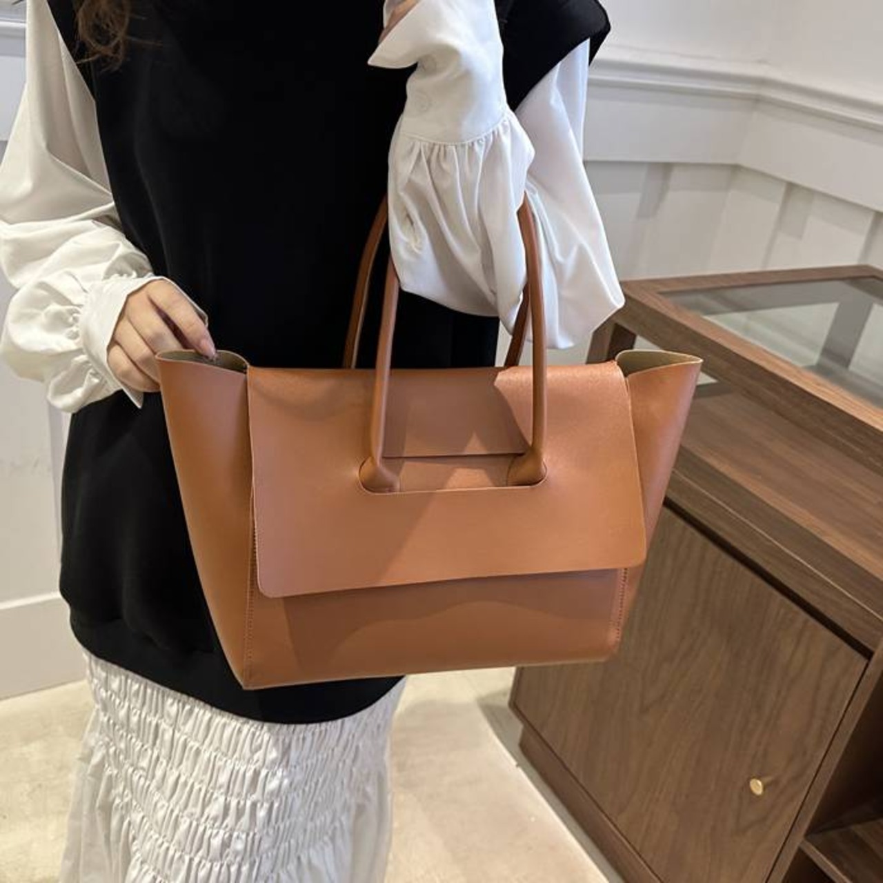 サイドの広がりあるシルエットが立体感をプラスし、持つだけでコーデのアクセントに。手持ちにも肩掛けにも対応できるハンドルの長さで、シーンに合わせた使い分けが可能です。内側には必要なものがしっかり収納できるスペースと仕切りがあり、整理整頓もラクラク。