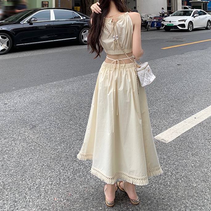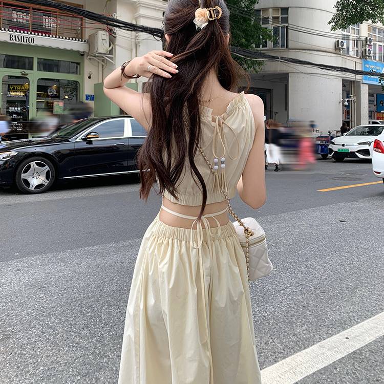 ① 夏のリゾートシーンでは、アイボリーカラーにラフィア素材のバッグやサンダルを合わせてナチュラルな雰囲気に。ビーチリゾートや旅行にも映える爽やかコーデになります。