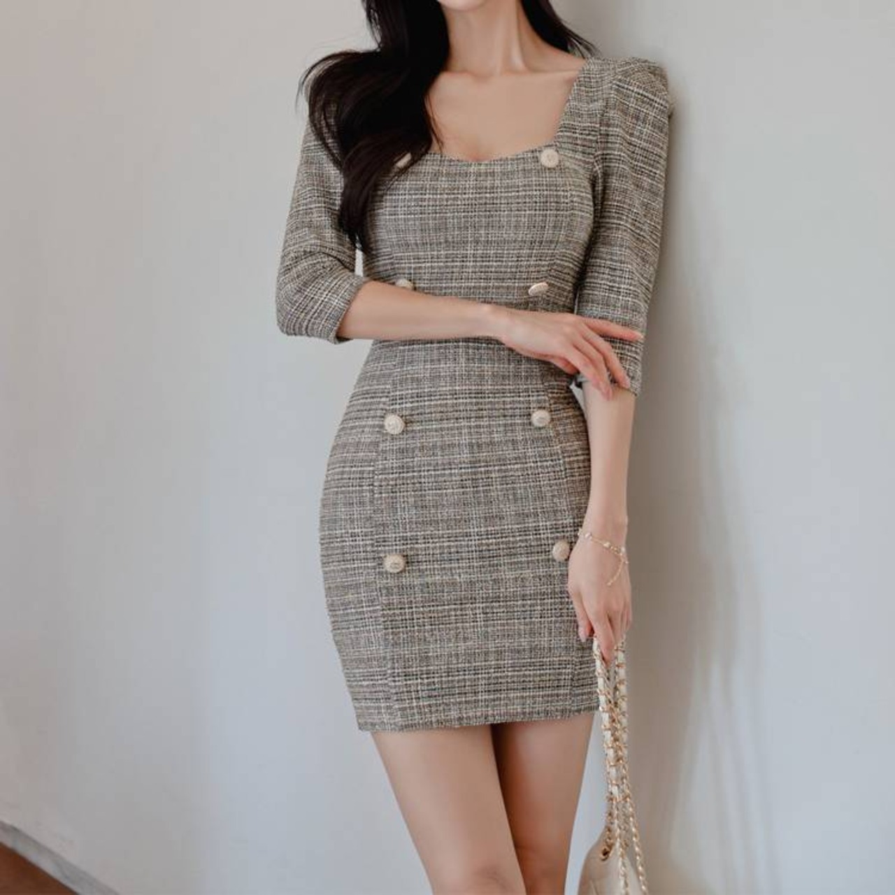 ツイード ワンピース タイト ミニワンピース レディース 長袖 五分袖 スクエアネック 韓国風 きれいめ 上品 パールボタン セクシー エレガント お呼ばれ デート 二次会 結婚式 通勤 通学 春 夏 秋 冬 20代 30代 40代 大人可愛い フェミニン おしゃれ 人気 トレンド 体型カバー グレー C-OSS0135