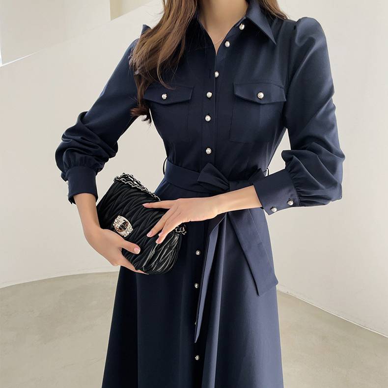 クラシカルで上品な印象を与える、ベルト付きの長袖シャツワンピース。