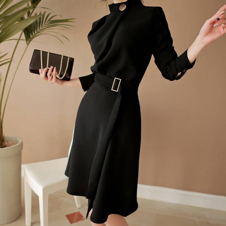 ブラック ボルドー ワンピース レディース ハイネック ベルト付き ドレス ミディ丈 七分袖 エレガント きれいめ 大人 上品 韓国風 フォーマル 通勤 オフィス お呼ばれ 結婚式 二次会 パーティー 秋冬 春 高見え 清楚 美シルエット Aライン 20代 30代 40代 50代 C-OSS0153