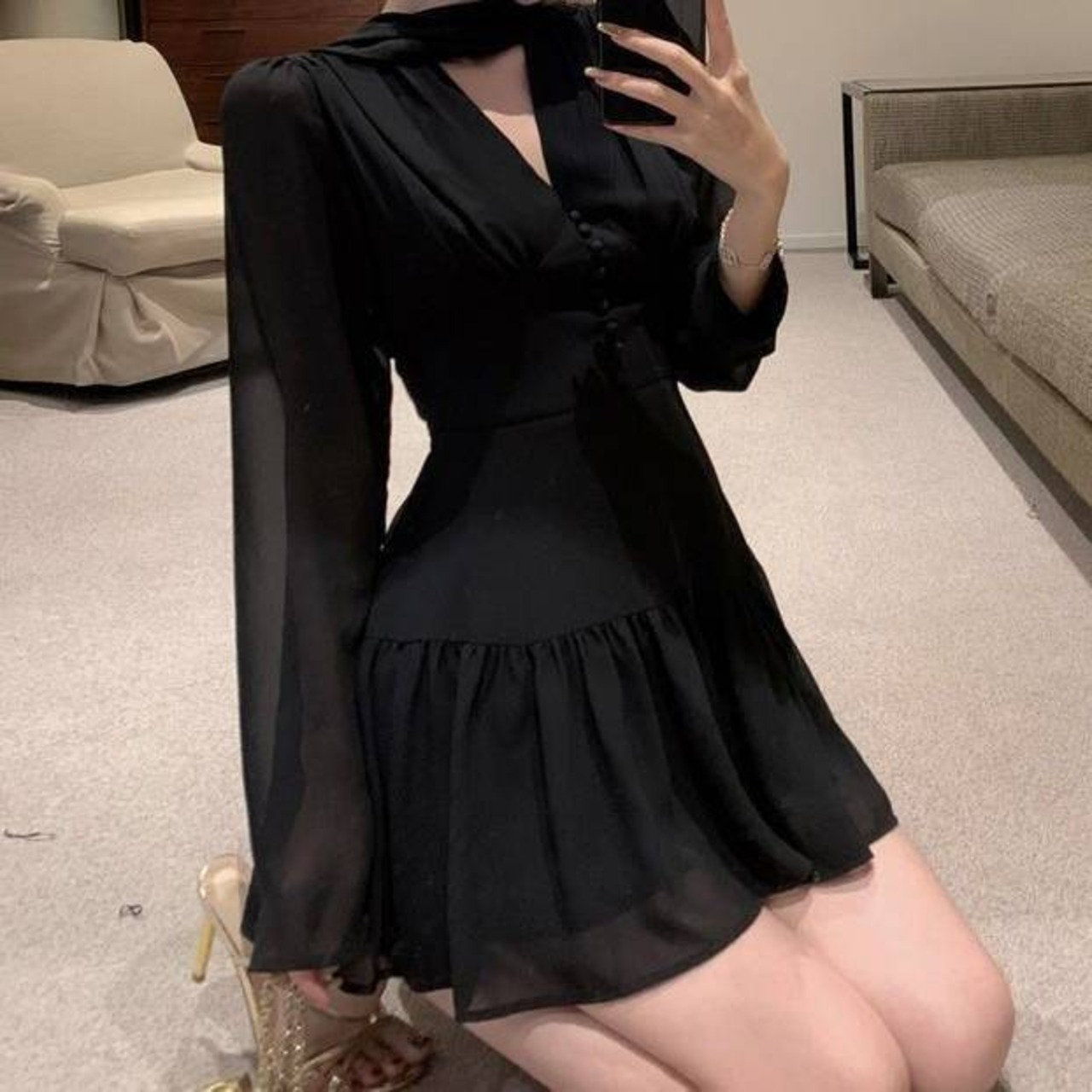 ワンピース レディース 長袖 ミニワンピース フレア Aライン リボンタイ シフォン 上品 きれいめ 韓国風 美脚効果 セクシー 可愛い エレガント 透け感 パーティー お呼ばれ デート ナイトドレス 春 夏 秋 冬 20代 30代 40代 人気 ブラック パープル C-OSS0157