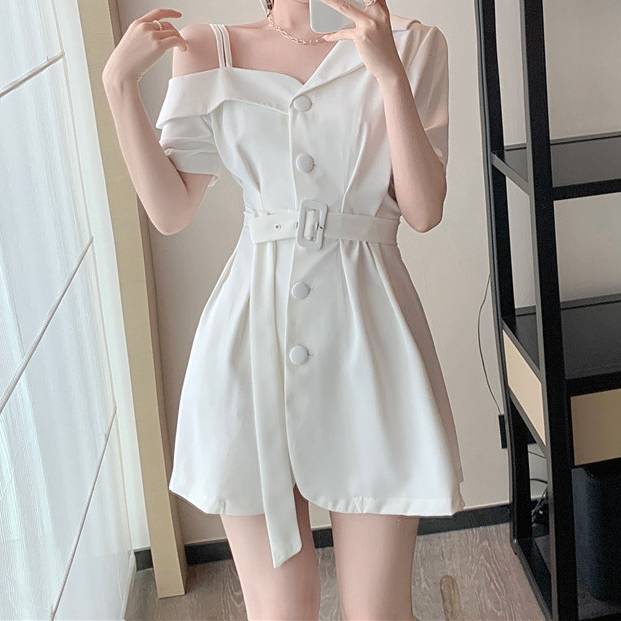 レディース ワンピース オフショルダー ベルト付き ショート丈 半袖 2WAYデザイン フロントボタン セクシー 大人可愛い 韓国ファッション 春 夏 秋 通勤 デート カジュアル きれいめ ブラック ホワイト 2色展開 S M L XL 体型カバー ミニワンピース C-OSS0168