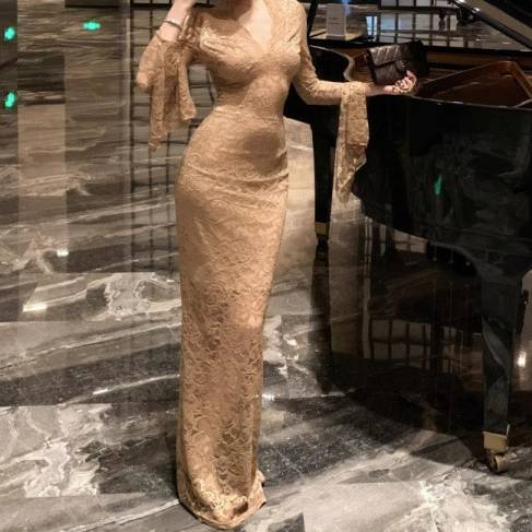 レースの美しい透け感と身体のラインを引き立てるスリムシルエットが魅力のロングドレスです。上品でエレガントな雰囲気をまとい、特別なシーンでも存在感を放つデザインに仕上げました。高級感のあるレース生地が光に映え、女性らしい美スタイルを演出します。