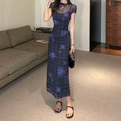 ロングワンピース レディース シアートップ レイヤード風 タイトワンピース 透け感 セクシー きれいめ 上品 スリム シルエット 美脚効果 体型カバー 韓国風 ロング丈 ブルー デート お出かけ ホテルディナー 大人女性 20代 30代 40代 おしゃれ 可愛い 着痩せ 春夏秋 冬 C-OSS0225
