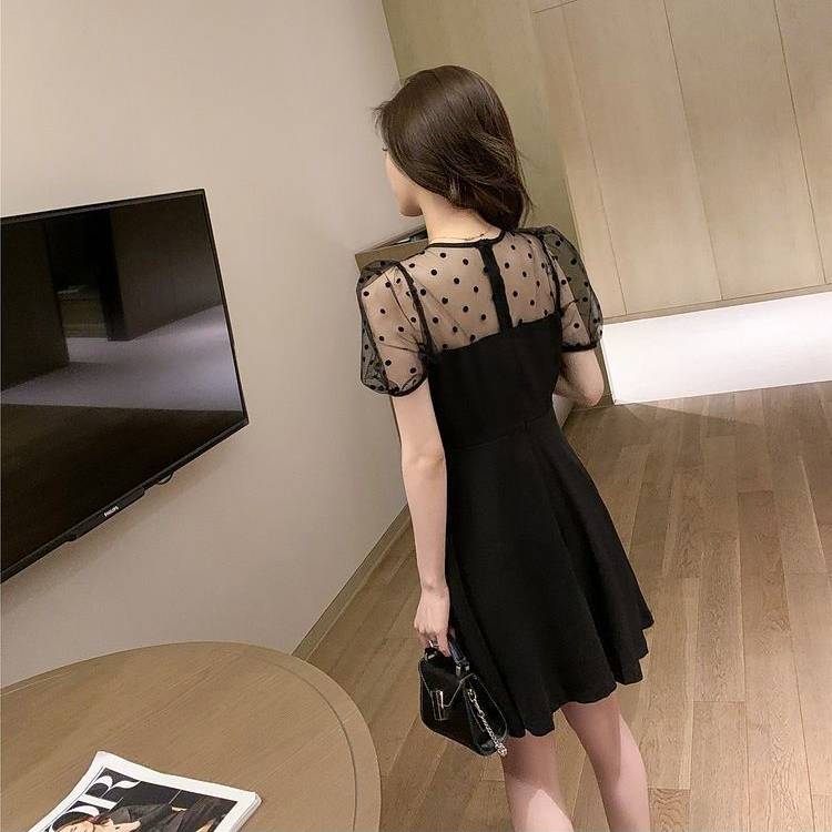 ブラック ワンピース レディース ドットチュール フレアドレス ミニ丈 シースルースリーブ 可愛い 上品 エレガント 体型カバー Aライン 透け感 お呼ばれ パーティードレス 二次会 デート フォーマル 韓国風 ファッション 春 夏 秋 冬 大人女子 トレンド 人気 着痩せ おしゃれ 清楚 C-COSS0190