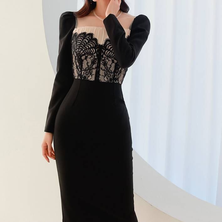 ブラック ワンピース レディース タイトワンピース ミディ丈 長袖 レース シアー 上品 エレガント セクシー フォーマル パーティードレス 結婚式 二次会 きれいめ 美シルエット 韓国ファッション 大人可愛い 20代 30代 人気 高見え トレンド 春 夏 秋 冬 C-OSS0217