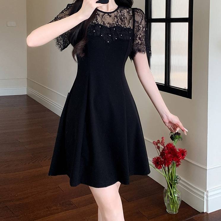 ブラック ワンピース レディース レース切り替え フレアワンピース ミニドレス 半袖 透け感 上品 きれいめ 大人可愛い エレガント 韓国ファッション デート お呼ばれ 二次会 パーティー 春 夏 秋 冬 オールシーズン 着回し フォーマル カジュアル おしゃれ 人気 トレンド C-OSS0195