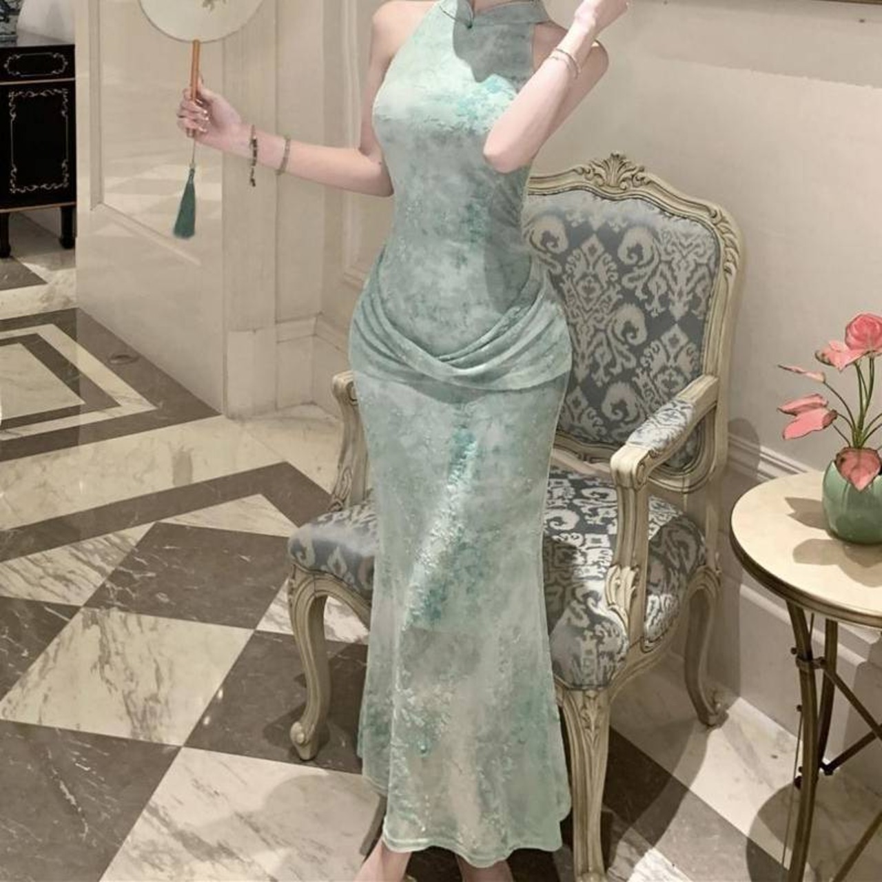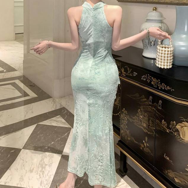 上品な透け感と、身体のラインを美しく引き立てるチャイナ風ホルターネックデザインのロングドレスです。淡いライトブルーカラーが清涼感と女性らしさを演出し、特別なシーンでも印象的なスタイルを完成させます。