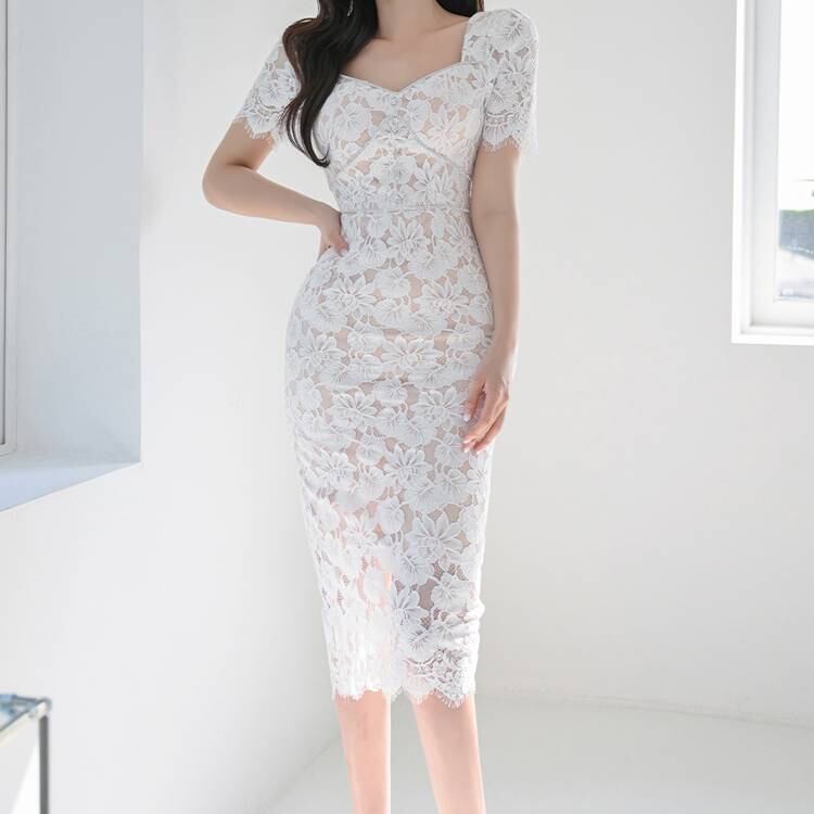レース ワンピース ドレス タイトワンピ ホワイト きれいめ 清楚 エレガント 大人 上品 パーティー お呼ばれ 結婚式 二次会 デート 20代 30代 40代 春 夏 秋 冬 韓国風 フォーマル レディース ロング丈 タイトシルエット 美脚効果 スリム見え 体型カバー C-OSS0258