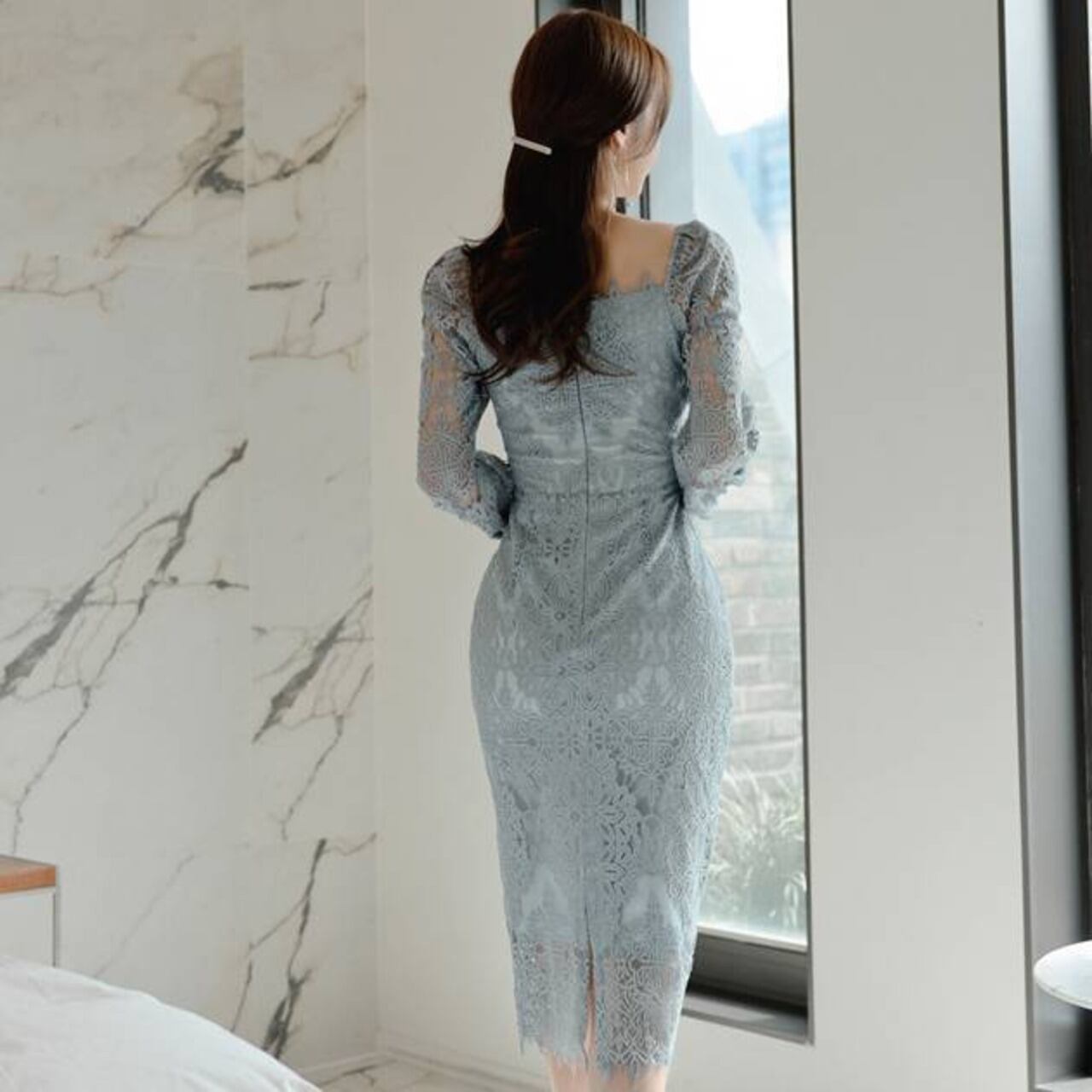 レースタイトドレス スクエアネック ワンピース ミモレ丈 タイトドレス 長袖レース エレガント 大人可愛い きれいめ 上品 パーティードレス 結婚式 二次会 お呼ばれ ドレス ワンピース ブルー フォーマル 韓国風 キレイ系 体型カバー 美シルエット スリムフィット レディース 春夏 秋冬 デート 食事会 発表会 同窓会 大人女子 上品ワンピース C-OSS0255