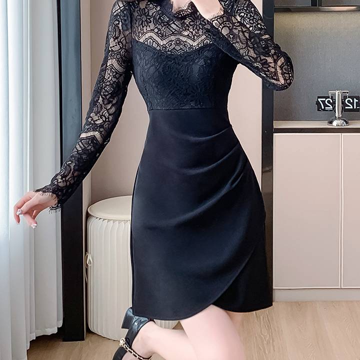 総レースの上半身とサテン調のスカートを組み合わせた、高級感あふれるタイトワンピースです。繊細なレースがデコルテから腕にかけて透け感を演出し、上品かつ女性らしい美シルエットに仕上がっています。ボディラインを拾いすぎないタック入りのスカートが、スタイルアップ効果を引き出しながら大人の魅力をしっかりと引き立てます。