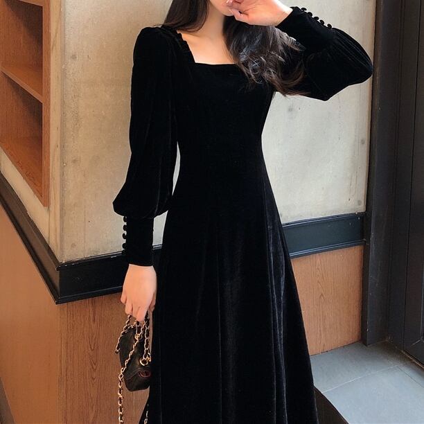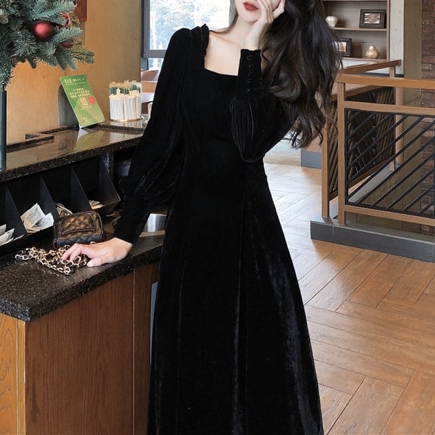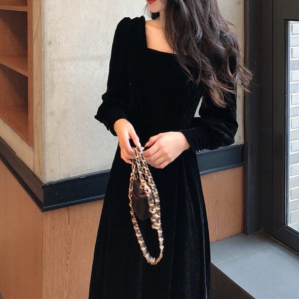 商品名:レトロクラシカル スクエアネック ベロアロングワンピース