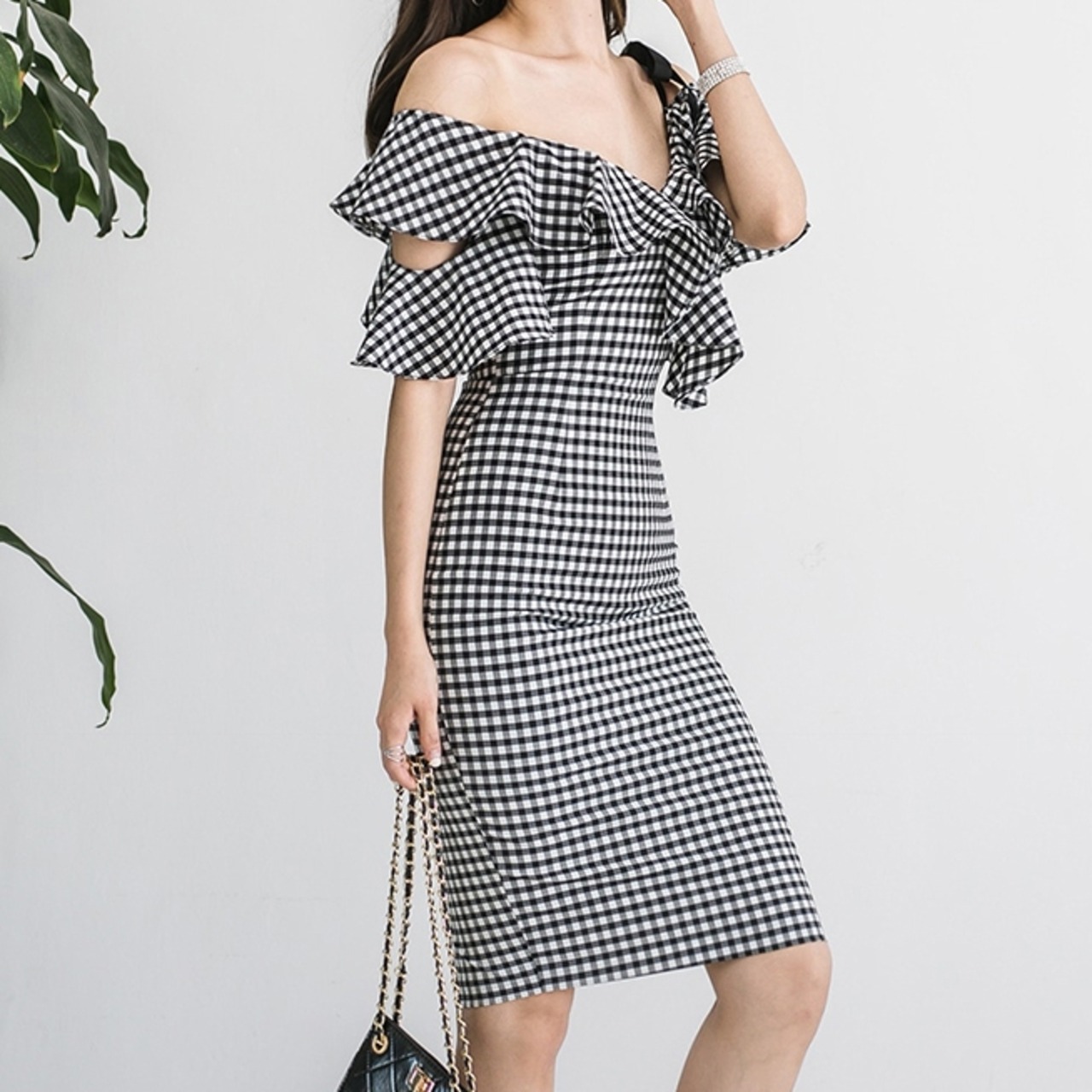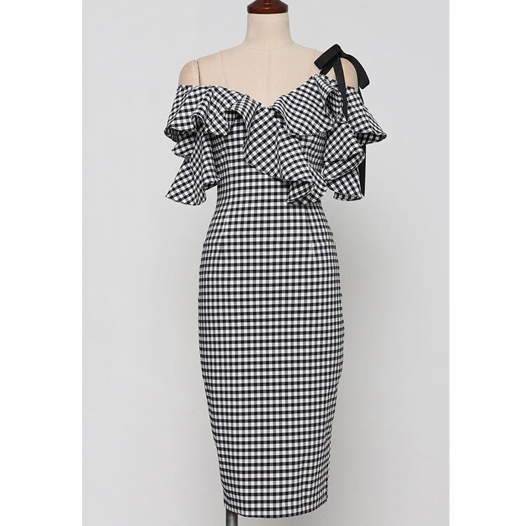 オフショルダー ギンガムチェック タイトワンピース  C-OSS0005