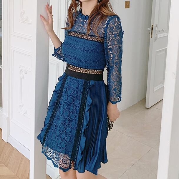 商品名:レース7分袖 プリーツ Aラインドレスワンピース